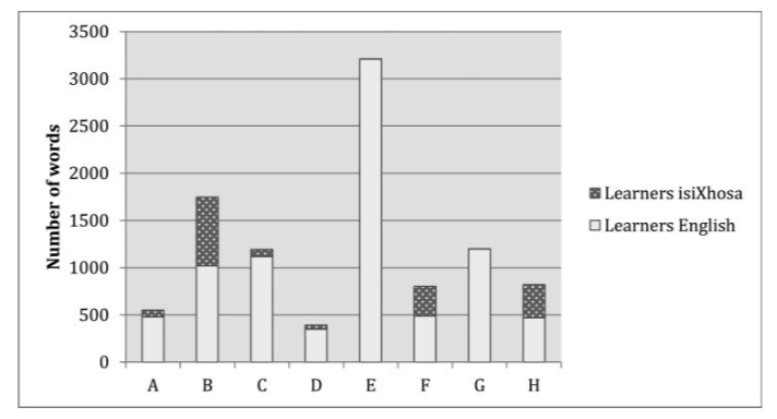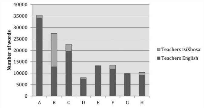 Probyn next did a quantitative analysis of English and isiXhosa use by teachers and students. First, she looked at how much the eight teachers (Teacher A through Teacher H) used isiXhosa: