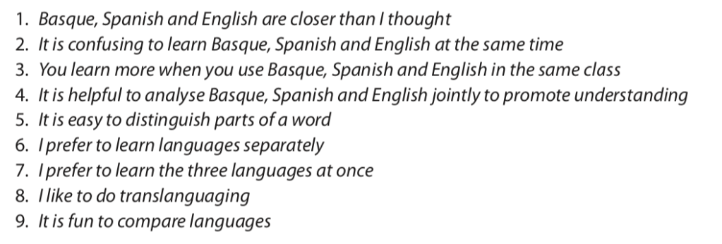 Therefore, the children found the intervention both enjoyable and useful. The authors admit that the pedagogical intervention correlated with test scores only mildly because of many other mitigating factors—e.g., “as participants in this study are students in the fifth and sixth years of primary school, it is likely that they have already developed some skills of decomposing words due to their exposure to orthographic representation [i.e., spelling and writing]” (p. 55). As for the motivational impact of translanguaging, if students feel enthusiastic about cross-linguistic comparisons, it is likely that they will pay more attention in class. The children clearly preferred working with languages together rather than separately.