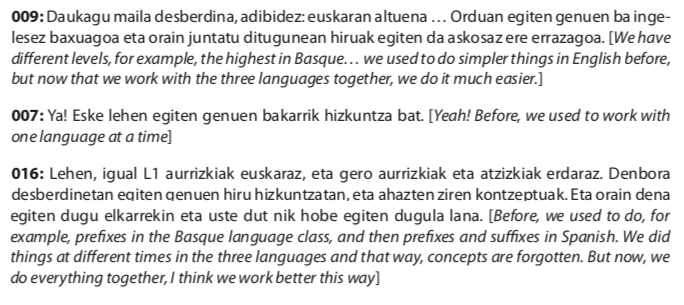 Finally, the researchers assigned the 104 students to 12 focus groups conducted in Basque, even though students c0uld translanguage if they chose. The focus groups asked two questions (students were given these questions beforehand and asked to write down their answers to prepare for the 10-minute group interview):