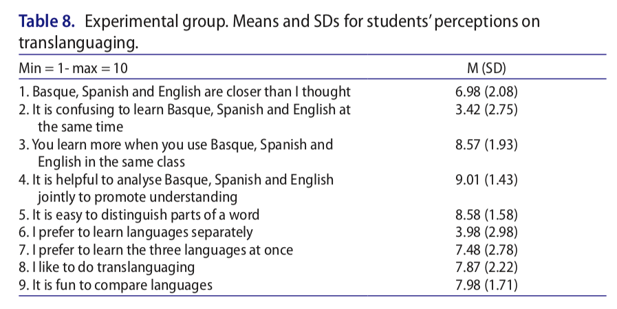 As well as administering this test, the researchers administered a Translanguaging Questionnaire to ask students how they felt about the activities. There were 9 questions which students had to rate from 1 (strongly disagree) to 10 (strongly agree).