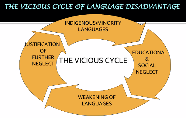 Mohanty (2018) points out that India has 300 or 400 languages, 20+ official ones (i.e., major national languages), 120+ in print media, about 90 in radio/TV, about 35 in films, and around 30 in primary education (this last figure is a generous estimate; we can say “30 languages” if we count special programs for specific communities). The number of languages taught in schools has declined, from 81 in 1970 to 41 in 1998 and about 30 today (by the above generous estimate). According to Mohanty, there is a roughly 3-level hierarchy, with (1) English at the top, (2) major national languages, and (3) minority languages. Mohanty calls the divide between (1) and (2) the English-Vernacular divide, and the divide between (2) and (3) the Vernacular-Tribal divide. Every year, linguistic diversity is lost, as students who speak minoritized languages shift towards nationally dominant languages and English like the three siblings he studied. This results in a “vicious cycle” for minority languages (see the figure below). Because of educational and social neglect, these languages become weak and underused, a fact observable in the younger generations, and this demonstrable weakening and reduction in domains of use becomes justification for further neglect. (Look into the work of Jasone Cenoz and Durk Gorter, on Basque language revitalization in Spain, presented in another Plurilingual Lab talk, to see why minority languages will not save themselves… they require governments, activists and users to maintain them.)