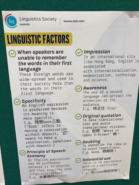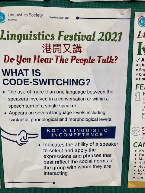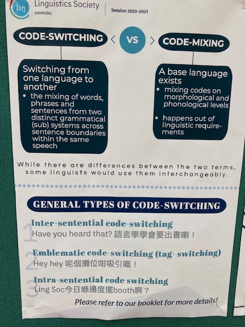 My photographs of the HKU Linguistics Society booth suggest, too, that Linguistics students call translanguaging code-switching. They do not think that people are switching between different language systems. They see them as using an integrated repertoire with resources from different named languages to make meaning, for many reasons besides lack of language competence (not knowing the word in the other language):