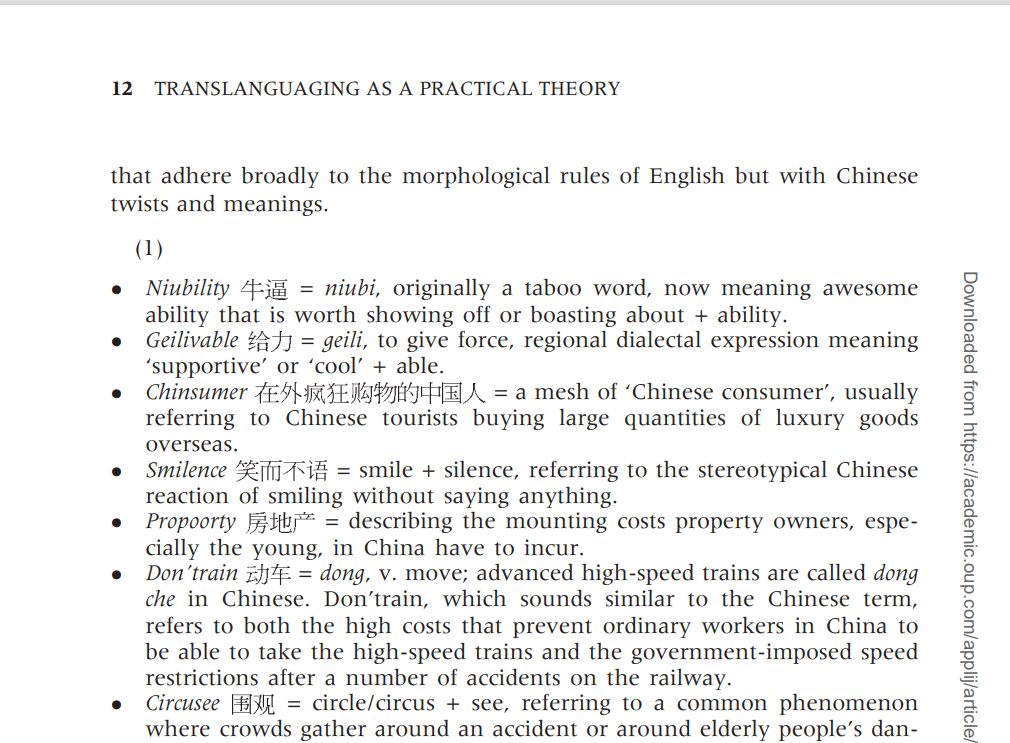 Li Wei. (2018). Translanguaging as a practical theory of language. Applied Linguistics, 39(1), 9- 30. https://doi.org/10.1093/applin/amx039