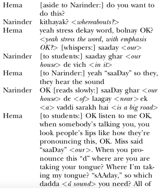 First, I want to highlight that Hema and Narinder also had things in common, for example their “nativist” stance towards pronunciation—which would, admittedly, be tested to some extent on the GCSE Exam; it would be thus remiss of them as educators not to make students aware of pronunciation. They had students recite particular sounds repeatedly, and look for distinctions between English and Panjabi sounds (e.g., in English, whether a sound like p is aspirated or not in one’s breath still makes it the same sound; in Panjabi, there is a difference in meaning, leading to a totally different word). Hema would say things like, “Look at me. Take your tongue to the top. OK, now say this five times. Come on, all together” and “Come on, pronunciation. Just think how your bibi <grandmother> would say it” (p. 943). In the example below, which is the beginning of a longer extract, she asks Narinder to model the correct pronunciation of SaaDay, meaning “our,” versus SaaDHay, which means “half past the hour” (pp. 943-944):