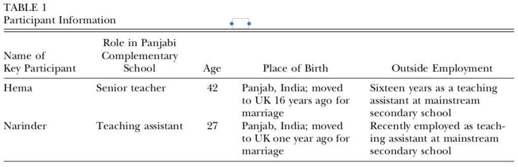 Over time, they were able to record the young people’s behavior towards their teachers. Hema and Narinder also worked as teachers in the mainstream secondary school where the heritage language class was held; Hema had worked there for 16 years, and Narinder for 6 months. As the table below shows, both had similar life trajectories—both had done their Masters in Mathematics Education (Narinder) and Economics (Hema) in India before immigrating to the U.K. for marriage in their 20s. Both described themselves as multilingual in English, Hindi, and Panjabi, and both (during interviews) commented on their “accented” English as well as students’ “accented” Panjabi.