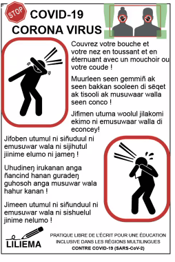 In conclusion, LILIEMA is a community literacy project run by local experts, reflecting people’s actual multilingual practices. It includes everybody, draws on the fluid and multilingual linguistic repertoires of speakers, and valorizes local and regional languages. It lets people write (1) monolingually, (2) in parallel translation (as in the COVID-19 posters), or (3) through translanguaging (as in participants’ messages for keeping track of livestock or doing their church work)… according to task, audience and needs. It empowers individuals, spreading as people who took the courses share practices with their networks, teaching what they learned to others. The project also showed that during crises like COVID-19, communication needs to appear in the appropriate linguistic resources and modalities. One must work with intended recipients to create messages in a medium that will be, according to the presenters, “accessible and trusted.”