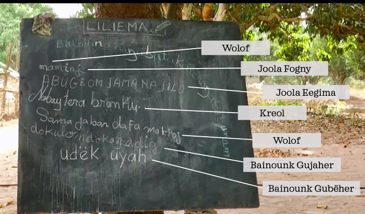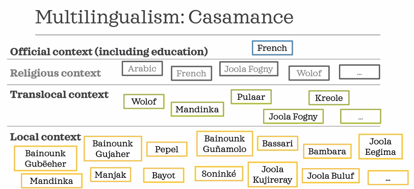 In the graphic above, “Translocal” means regional lingua francas and “Local” means innumerable other languages spoken in villages, some not listed. As Lüpke et al. put it, “The smaller the languages people speak, the more multilingual they are.” The applied linguist Tove Skutnabb-Kangas pointed out the global phenomenon that people from non-dominant groups in societies must become bi/multilingual in at least their language and the national language, if not also layers of regionally dominant languages, simply as a matter of survival. On the other hand, L1 speakers of dominant languages engage in less language learning and generally have a lot less knowledge of languages, even if their ways of speaking are praised as standard (Skutnabb-Kangas, 1981). If governments implement literacy campaigns, even for minoritized languages, they tend to happen in one language. In Casamance, due to hosting strangers/members of professional groups, intermarriages, child fostering, economic migration, seasonal labour, nomadic lifestyles, and crises like COVID-19, this monolingual literacy is not really what people need.