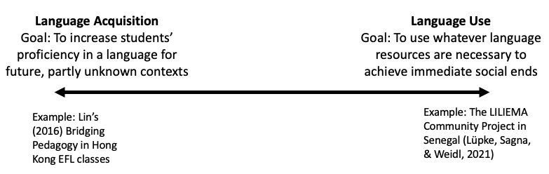This brings us back to what we should be studying: translingualism in a host of different educational contexts, with a host of different populations, as García and Otheguy argue for, and with a critical orientation. Towards one end of the cline, we harness the whole language repertoire to promote language acquisition, sometimes for unclear future ends (Rainbow Diagram); towards the other end, we use the whole language repertoire for immediate community needs (example of LILIEMA). Thus, we must combine pedagogy based on needs analysis, a translanguaging stance (and design, and shifts), and a plurilingual epistemology to figure out what must be done to develop critical pragmatism in any educational context.