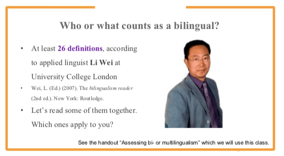 They begin their article by listing Canagarajah’s code-meshing, Jørgensen’s polylingualism, Pennycook and Otsuji’s metrolingualism, García and Li’s translanguaging, and Coste, Moore, and Zarate’s plurilingualism: “each term has its own particular focus, history, contexts, and ideological connections, as well as proponents and detractors” (i.e., people who do and do not like it) (p. 1). In this article, they are not advocating for plurilingualism over other terms but wish to define what it is and is not, against those who they feel misunderstand it. What all the above terms have in common, they explain, is the rejection of a traditional definition of bi/multilingualism as involving complete, native-like control of two or more languages. That is, you do not need to be this kind of bi/multilingual to call yourself a bi/multilingual. Actually, at around the same time translanguaging as a term was popularized by Ofelia García, her close collaborator Li Wei (e.g., García & Li, 2014) wrote against this definition of bi/multilingualism (Li, 2007). Here is a slide about this that I used to show my students in SLS 150: Learning Languages and Communicating in a Globalized World, a first year liberal arts course at the University of Hawai’i at Mānoa: