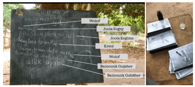 On the other side of the cline, Language Use, are community-based educational initiatives that foster literacy in order to get important things done, for example a grassroots COVID-19 information campaign in villages in southern Senegal run by the literacy organization LILIEMA (Lüpke, Sagna, & Weidl, 2021). LILIEMA teaches adults (many of whom failed to develop literacy in formal schooling because of its oppressive monolingualism and standardization) how to write translingually—and indeed, the adults successfully learned literacy skills for farm inventories, church congregation management, etc. These literacy skills involved translanguaging in writing, because that is how their society functioned, even though no school examination would require writing like that. For in the case of LILIEMA, the test is real life: were people adequately informed about COVID-19 through the translingual posters? But while classroom learning to some extent has to reflect real world needs, it cannot totally be 100% like the real world communication (which is more often translingual) because formal education has its own goals and social setting, which can be inclusive and critical in the hands of the right teacher, but does not budge on certain points like standardized assessments. This is why LILIEMA researchers explained in their webinar (which I summarize in this post) why grassroots education cannot be like school, and school cannot be like grassroots education.