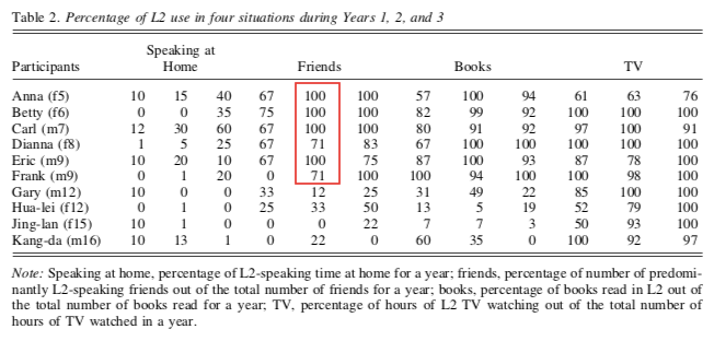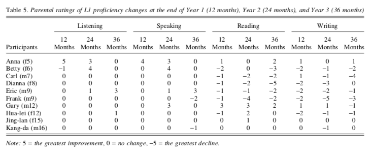 All in all, it was clear that the first/heritage language, with no great opportunities for maintenance in this setting, was less developed in ALL 10 participants over time. The older participants’ maintenance was not gain, even though they continued to use the language, and eventually all 10 participants—who today would be in their 30s and 40s—would have had their postsecondary education in the U.S. and taken up jobs in English, if they didn’t move back to China or Taiwan. [Side note: Given the Internet age (Lam & Warriner, 2012) and access to transnational social networks for heritage language maintenance, as well as the rise of Mandarin as a global language, this study would be well worth replicating in 2021 to see if findings would be different.]