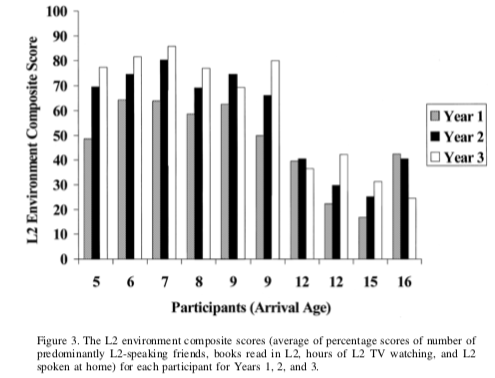 Participants’ scores on the grammaticality judgment tasks (in English) and translation tasks were equal in Years 1 and 2, but the younger ones did better in Year 3. Note that these tasks were probably related to nativelikeness; by Year 3, the difference would probably have concerned articles and prepositions, not, say, level of academic vocabulary. There is evidence that older arrivals may perform better on academic tasks than younger arrivals because of transferring previous subject knowledge from the first language (see Roessingh, 2008, another longitudinal study comparing older and younger Age on Arrival worth looking at).