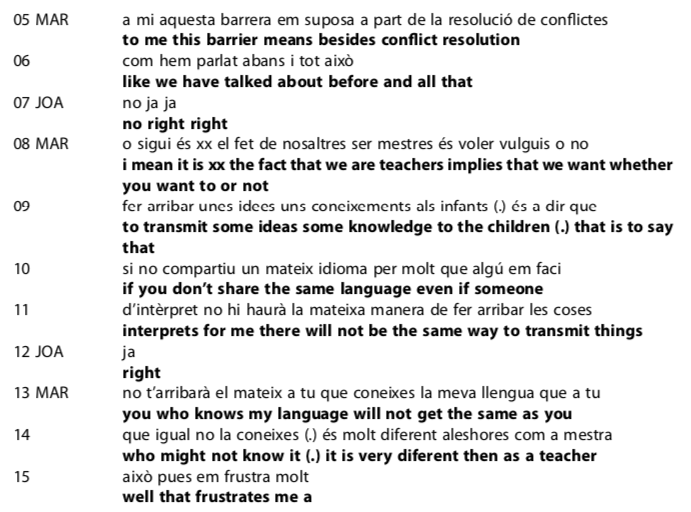 In lines 1-4, Joan expresses the belief that without a common language, not even English, there is no possibility of reaching understanding. She sees English as the lingua franca that allows communication in global scenarios, if no other languages are shared. In actual practice, she may discover that the students probably know more English, and Catalan and Spanish, than she expected, and that understanding can be bridged with a variety of strategies, from gestures to the language brokers she mentions. (Language repertoires do not need to overlap as much as she thinks, and people do not need to select a single code, either, as “it is people, not language codes, that understand one another”; Bamgbose, as cited in Vettorel, 2016, p. 127.)