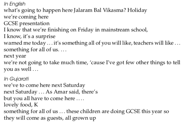 Sociolinguistically speaking, translanguaging integrates codes to create the whole message. Any distinctions between codes would be meaningless. Below is an example from the research of well-known translanguaging scholars Creese and Blackledge (2011, pp. 11-12). In the following example, the principal of a Gujarati heritage language school in the U.K. is giving announcements during an assembly: