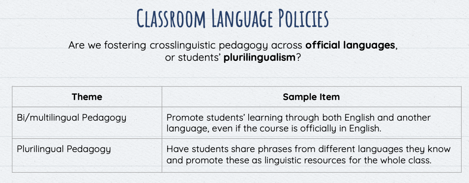 My colleagues Shakina Rajendram, Andrew Coombs and I developed a survey of these practices that we presented at the American Association of Applied Linguistics (AAAL) conference in March 2022, the time this blog post was written. Shakina is a translanguaging researcher and Assistant Professor at the Ontario Institute for Studies in Education, University of Toronto; Andrew is a postdoctoral scholar and educational assessment specialist at Memorial University in St. Johns, Newfoundland. The purpose of the survey is to operationalize constructs clearly when we talk about translanguaging pedagogy in classrooms, and to give teachers an overview of the full range of such practices when they take the survey. Now I’ll share with you a few of the slides I presented about our research.