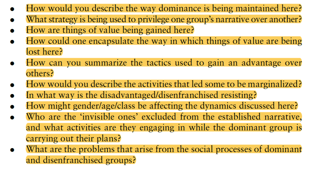 Moreover, unlike the original GT, critical GT does not only focus on the informants, but contextualizes the theory in its broader historical, cultural, or economic milieu, as related to local, national, or international politics. (The difference between Glaserian and critical GT is actually similar to the difference between Conversational Analysis and Interactional Sociolinguistics—and there are possibly other examples of types of research that use the same methodological tools but have “apolitical” versus “political” lenses.) Unlike Strauss and Corbin, Hadley thinks it’s enough to do open, focused, and theoretical coding without axial coding. Beyond asking the question all GT researchers ask, “What is going on here?”, in critical GT, the researcher asks, “Why is this going on?” (p. 54; my italics). Hadley believes that theoretical coding can be guided by the following questions: