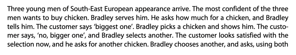Then there are narrative observations, which recount what is happening. An example that I’ll include here (not from a classroom but a marketplace in the UK) is from Blackledge and Creese (2017):